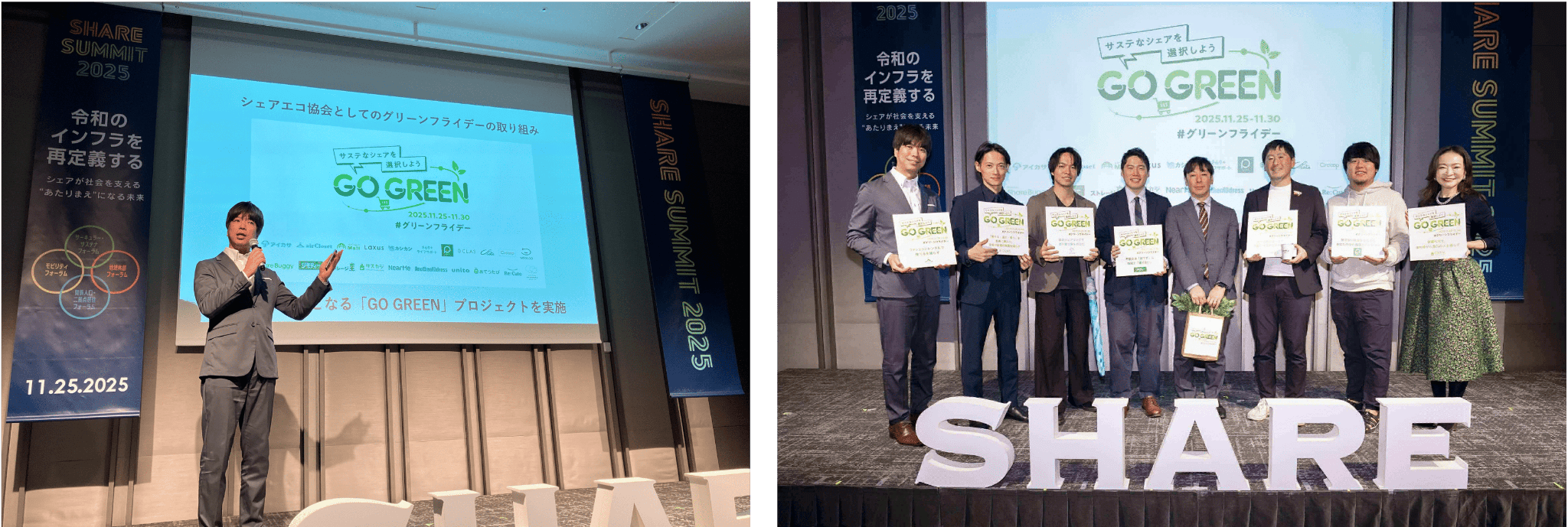 経済産業省様に後援していただいている「GO GREEN プロジェクト」では、環境に配慮した行動を意味する「GO GREEN」をテーマに、シェアエコ協会様およびシェアリングサービス事業者19社が連携し、2025年11月25日(火)〜30日(日)の6日間、各社のサービスロゴをグリーンに変更するとともに、サステナブルな消費に関するメッセージを発信します。さらに今年は、11月25日(火)に開催された「SHARE SUMMIT 2025」内でグリーンフライデー特設ブースを設置し、来場者に具体的な行動のきっかけを提供しました。