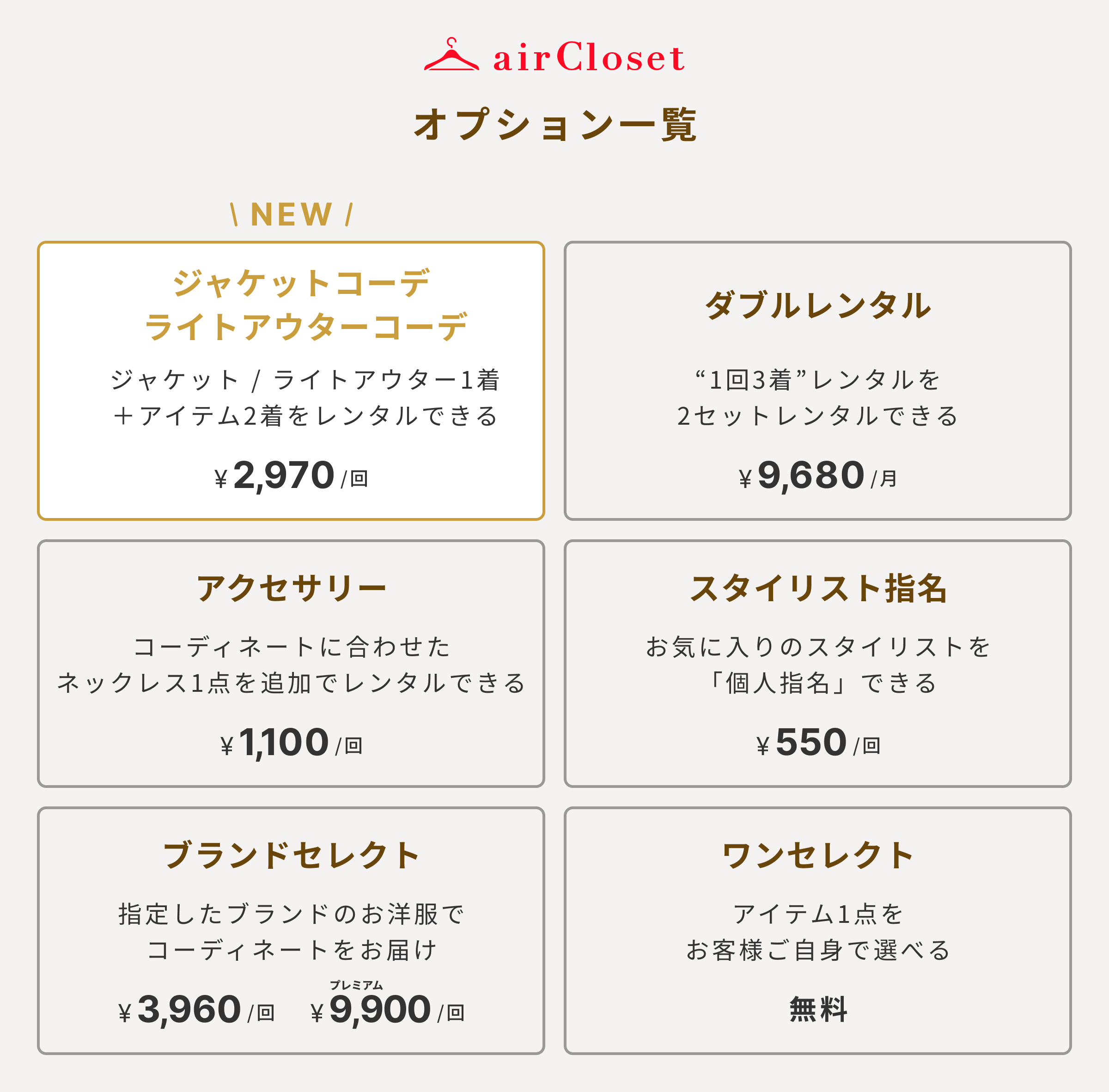 さらに、airClosetでは各種オプションを自由に組み合わせてカスタマイズすることで、ムダなく、自分らしくファッションを最大限楽しむことができます。今後も、お客様がファッションレンタルを通じて自由に新しいファッションとの出会いを楽しめるよう、順次機能拡充を進めてまいります。