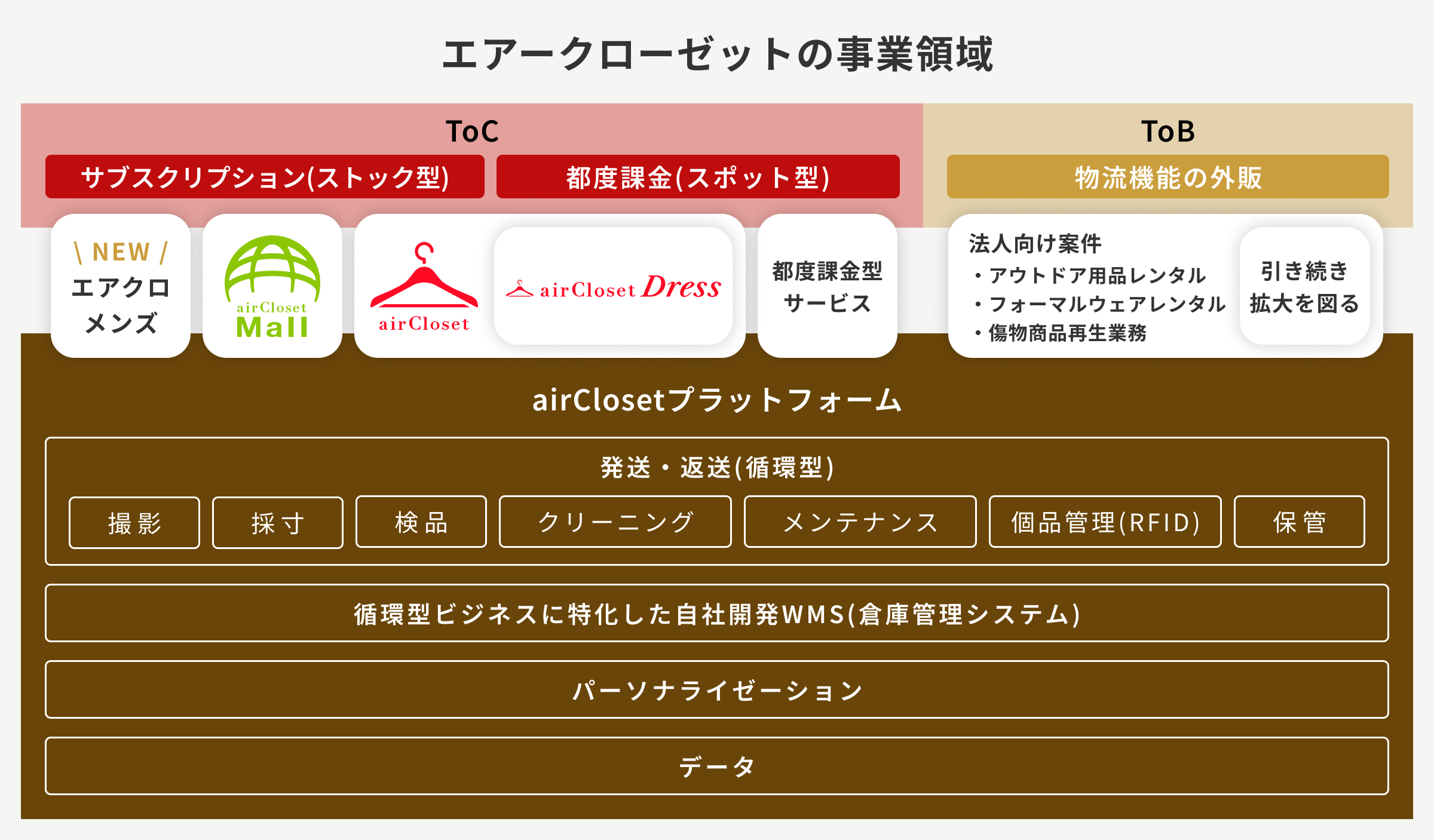 当社は、お洋服をシェアリングする循環型ビジネスである『airCloset』の運営を通じて、循環型プラットフォームを構築してきました。本プラットフォームには、発送・返送に対応する循環型物流の仕組みや自社開発WMS(倉庫管理システム)、さらには顧客・商品に関する各種データを管理するシステムやデータを活用したパーソナライゼーションの仕組みが含まれます。
