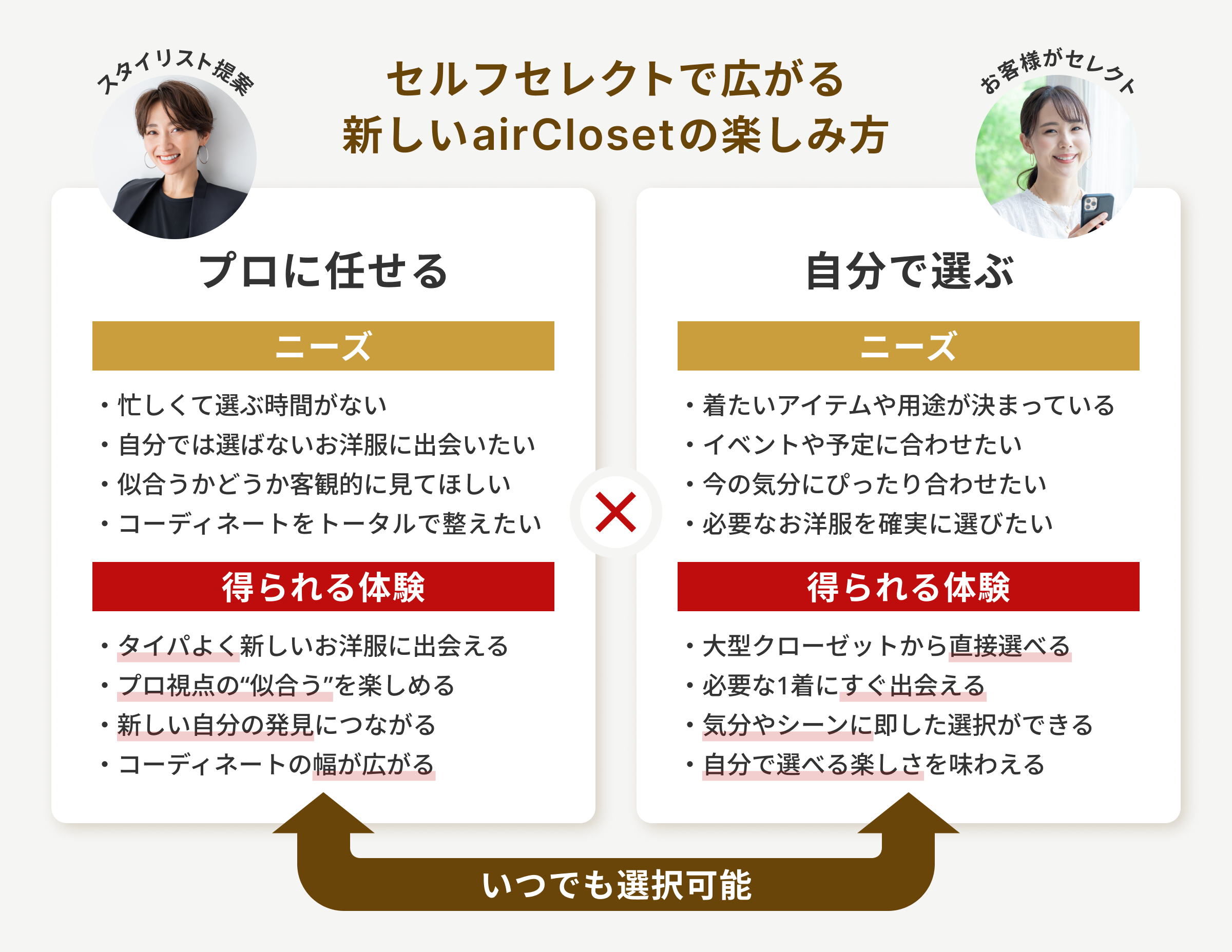 「セルフセレクト」は、スタイリスト提案というairClosetの基盤価値を活かしながら、選択肢を広げることで、より多様なニーズにフィットできる新たな体験です。